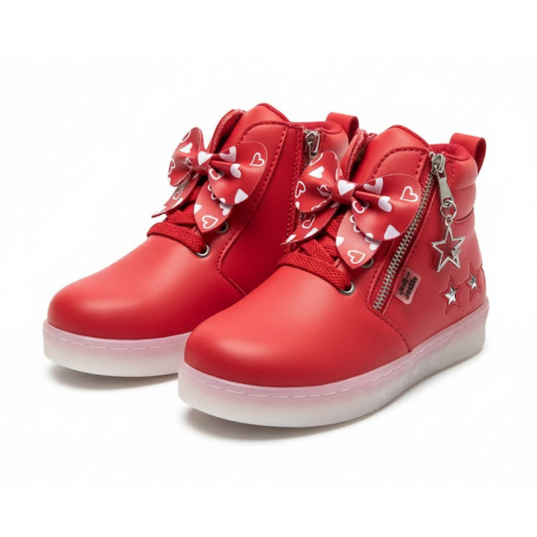 Botín rojo con moño, cálido, coqueto y suave para niñas.